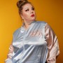 Represent the IHEARTBBW brand with this light blue with blush pink silk bomber jacket.